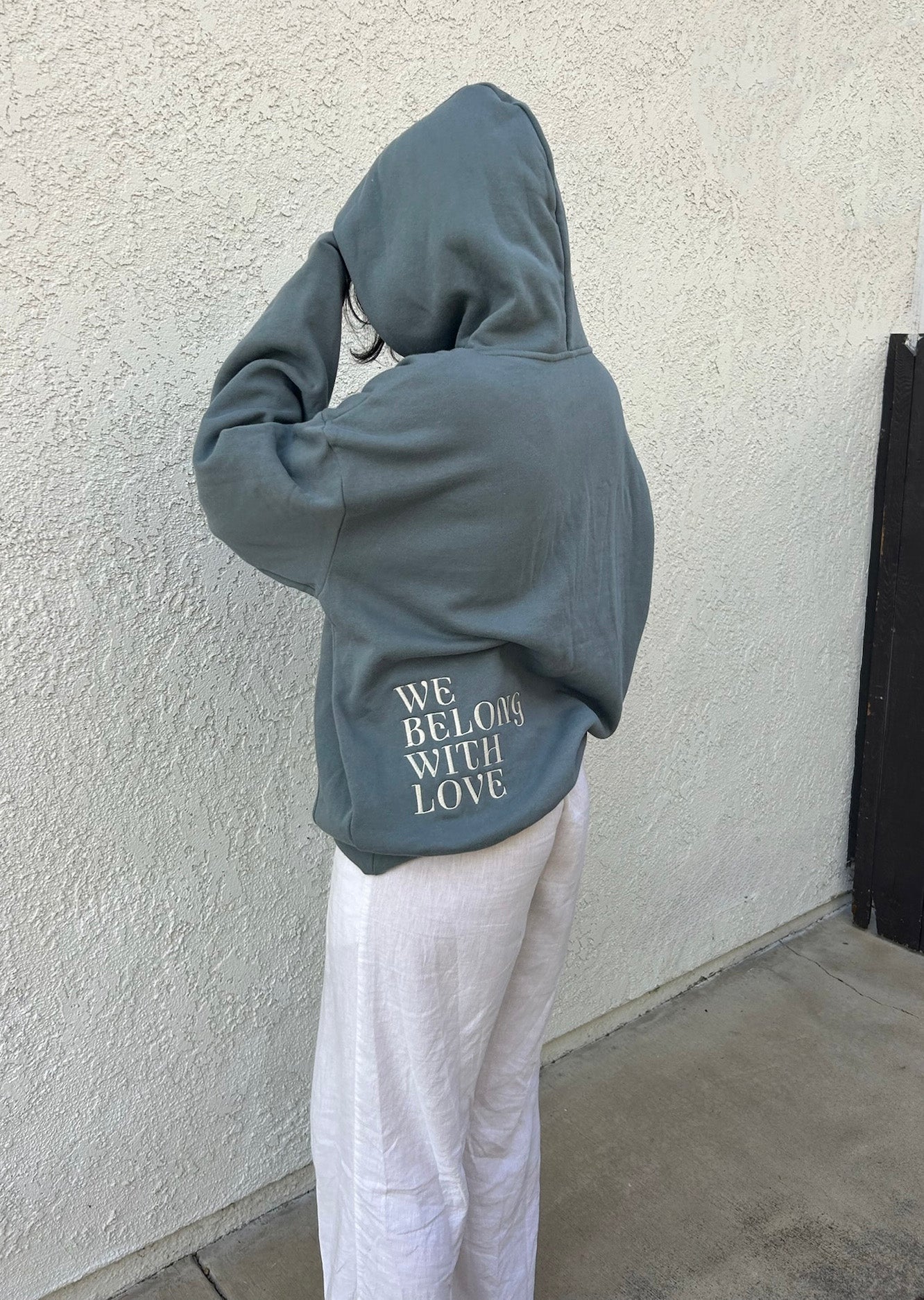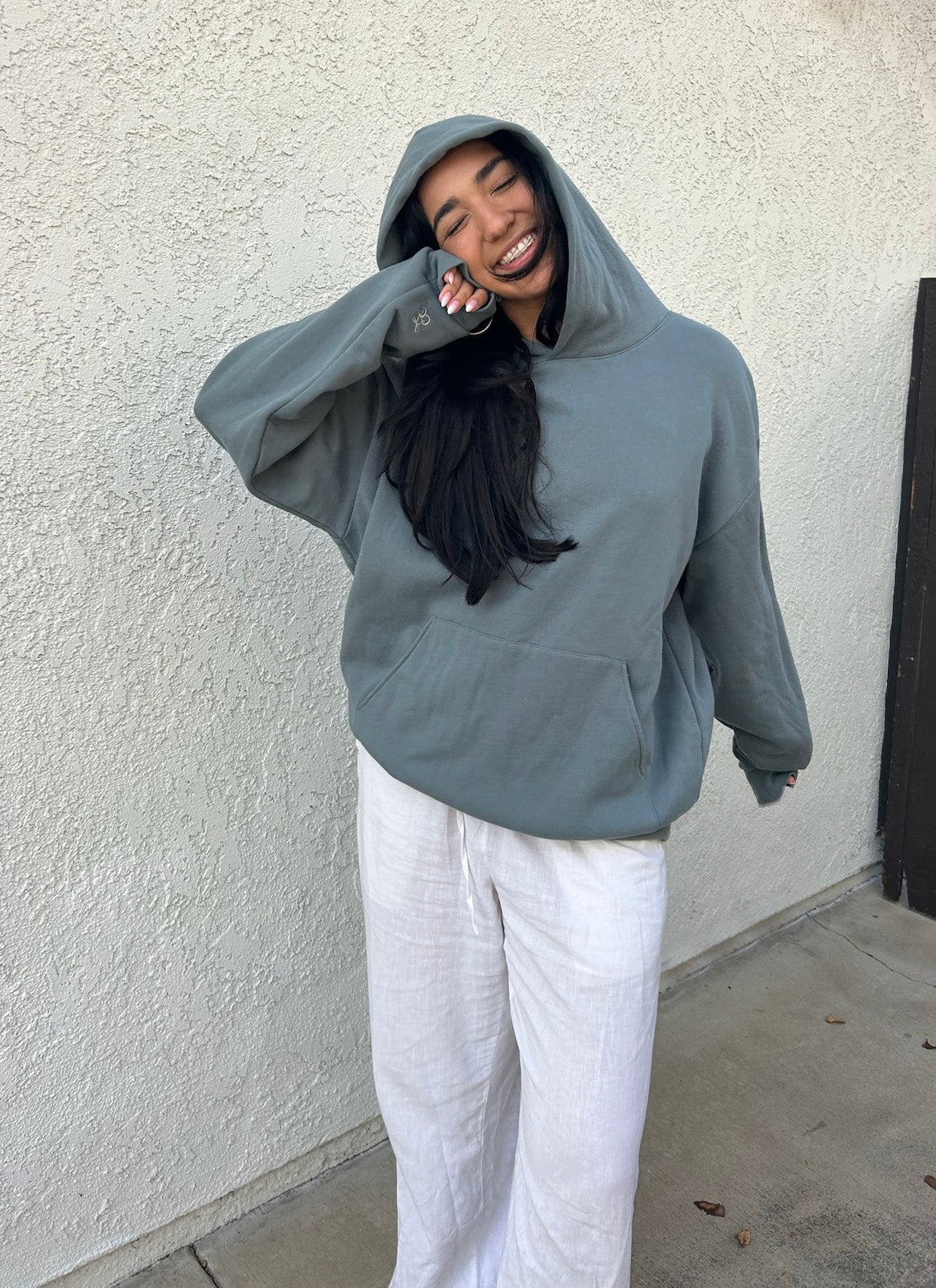 Hellblaue Wirbel und dunkelsilberne Stickereien auf diesem aschgrauen Rundhalsausschnitt, Kapuzenpullover oder T-Shirt