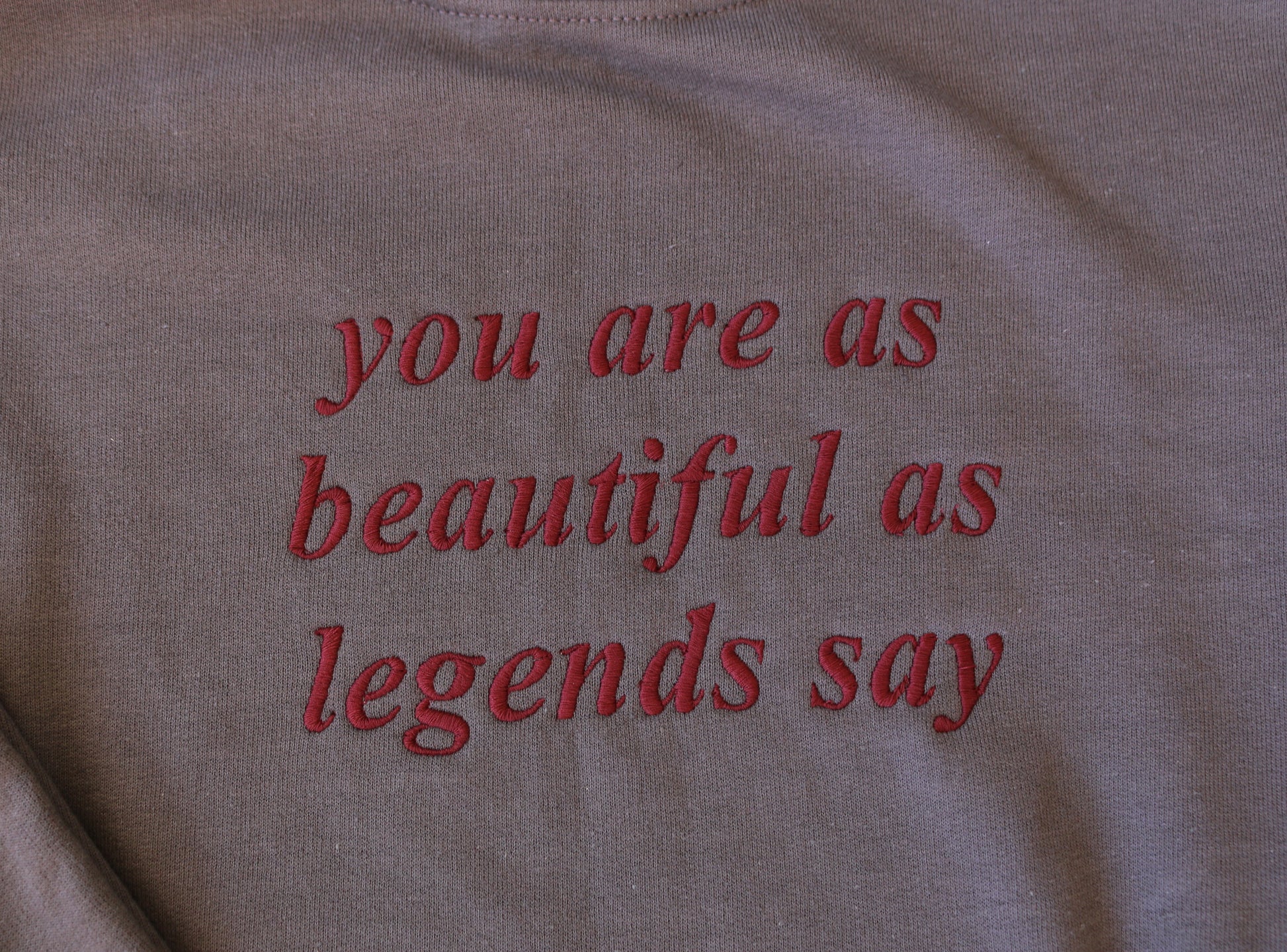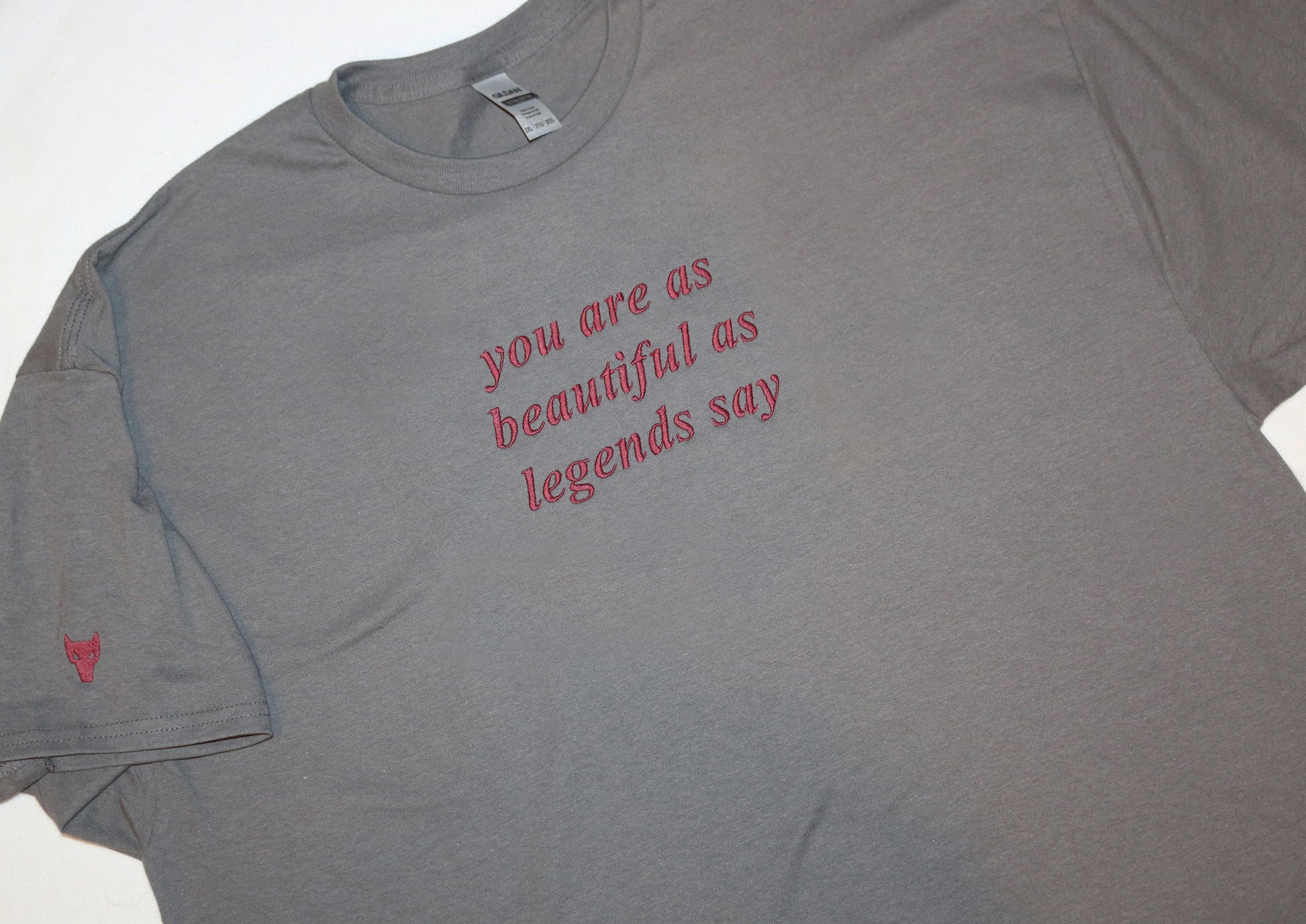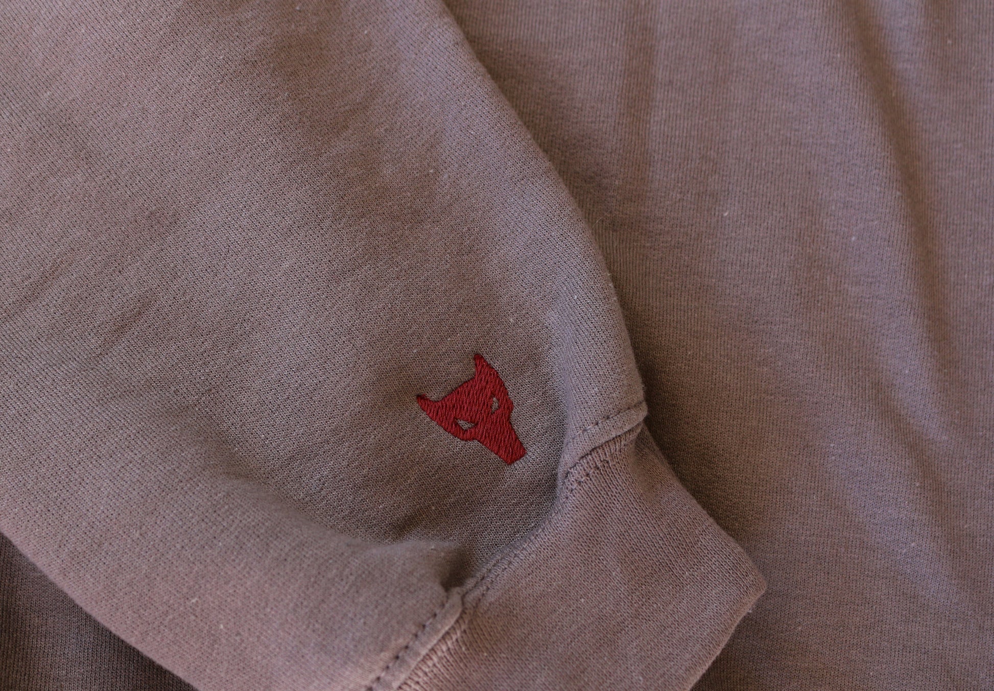 Beautiful burgundy embroidery on a charcoal grey crewneck, hoodie or t-shirt with the lil' character stitching on the sleeve