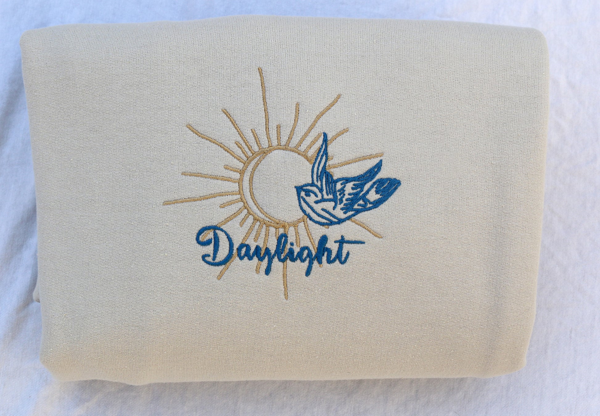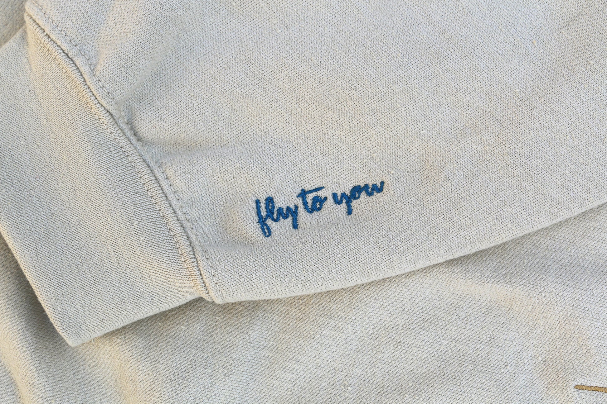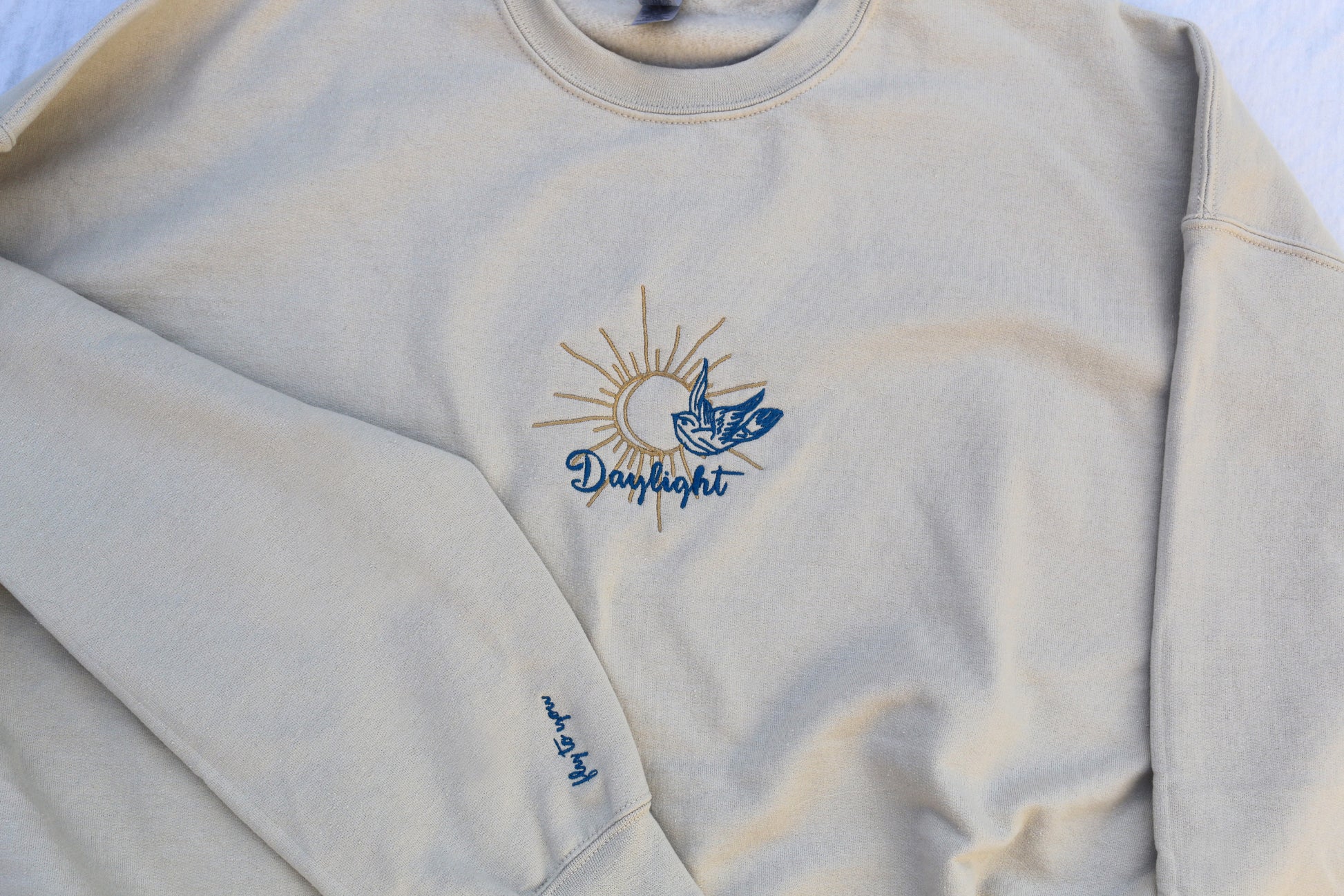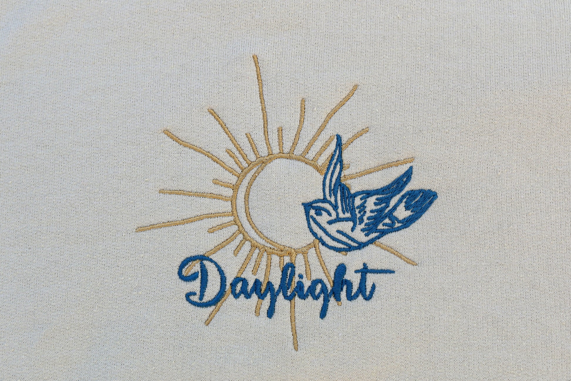 Sun is stitched in a beautiful gold thread. Blue Bird and Daylight are a brilliant blue stitching. fly to you is stitched in the same blue on the sleeve.